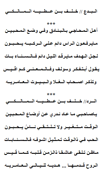 هذه القصيده على لون المجالسي وهي بدع ورد طبعا في البدع عملت تمهيد للرد والقصيده في مجملها تدور حول الحب والمحبين ومقارنه عشاق هذا الزمان وبين عشاق الفتره الزمنيه التي تناقلت فيها الركبان اخبار عشقهم ايام قيس بن الملوح وقرات في بعض المقولات عن قيس ان لليلى ليست بهذاك الجمال الذي يستحق هذه التضحيه والحقيقه ان الكثير يتصور ان الحب والعشق ينحصر في الجمال الخارجي للمرآة بينما الحب والعشق الحقيقي هو لجمال القلب والنفس .